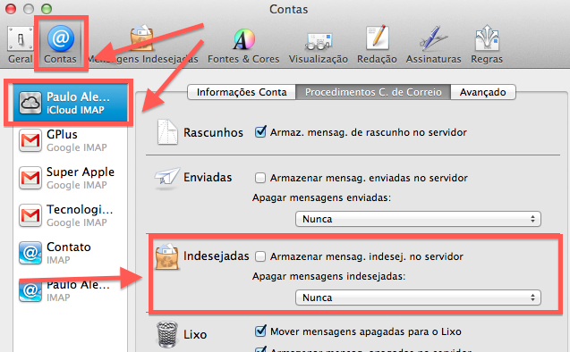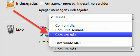 Por padrão o Mail do Mac direciona spams para uma pasta chama Junk e nunca as apaga. Isso é perfeitamente aceitável, uma vez que emails importantes podem ser direcionado para esta pasta equivocadamente. Uma boa opção é ativar a função Apagar mensagens indesejadas com um Mês.