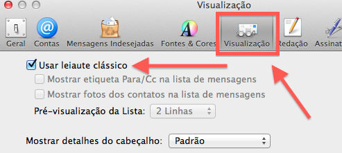 - Em Preferências do Mail clique em Visualização > Usar Layout clássico