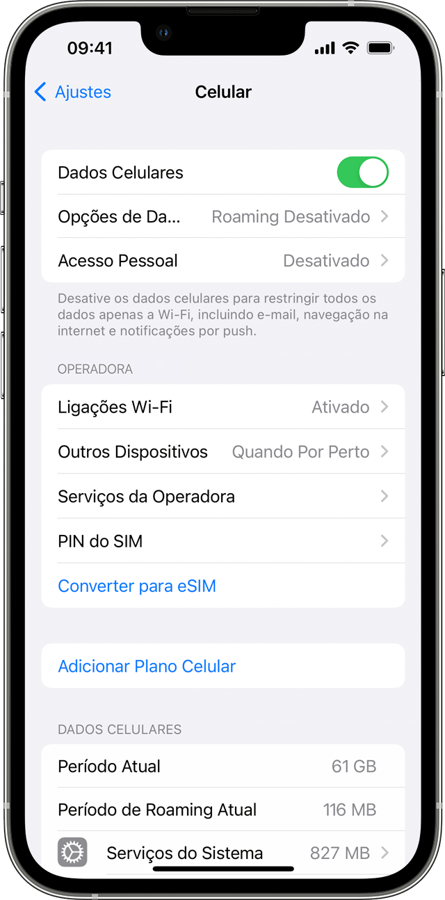 Para ativar ou desativar os dados celulares, acesse “Ajustes” e toque em “Celular” ou “Dados Móveis“. Em um iPad, acesse Ajustes > Dados Celulares