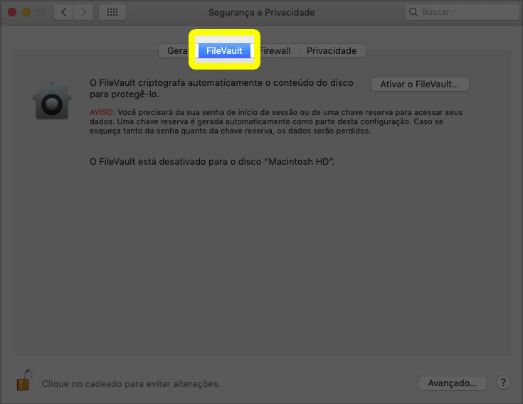 Neste caso o FileVault é a melhor opção, não só por que criptografa seus dados confidenciais, mas também ativa outros recursos de segurança, como a senha de acesso ao sistema.