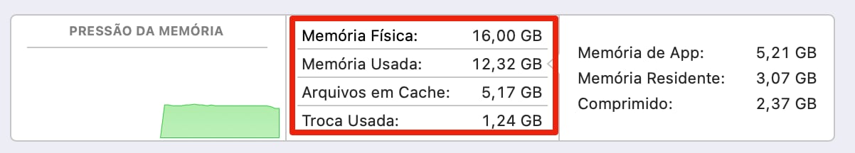 - Vermelho: Se o gráfico estiver vermelho, significa que o Mac está com dificuldades para gerenciar a memória, e o desempenho pode estar comprometido.