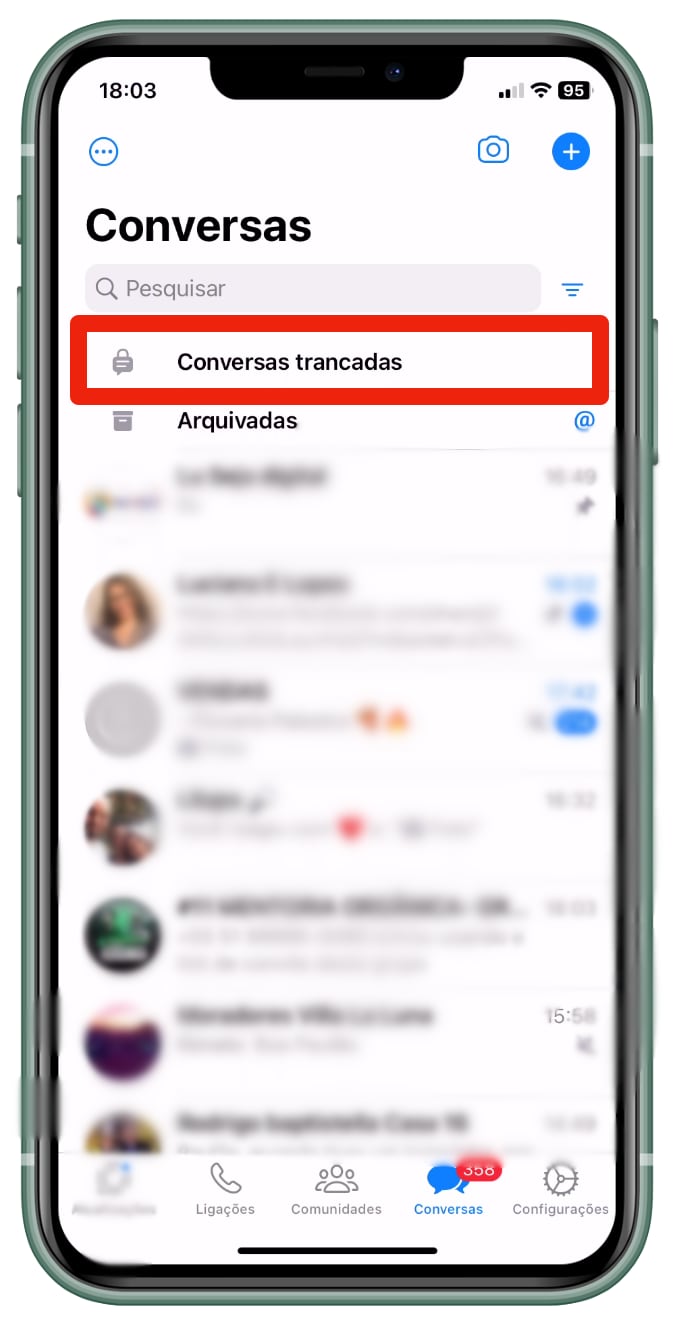 3. Desça até a opção “Trancar conversa” e siga as instruções para configurar;Na tela inicial, localize a seção “Conversas trancadas”, acesse “Configurações” e ative “Ocultar conversas trancadas”;