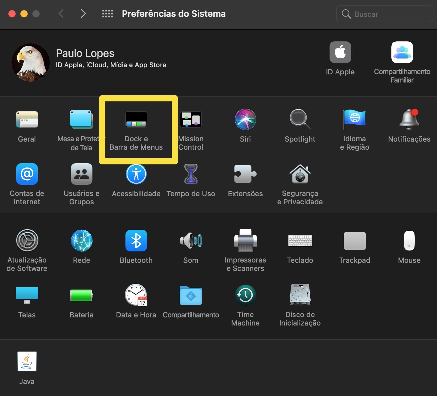 2. Isso abrirá uma nova janela no seu Mac. Escolha “Dock e Barra de Menus”, que é a terceira opção no menu localizado.