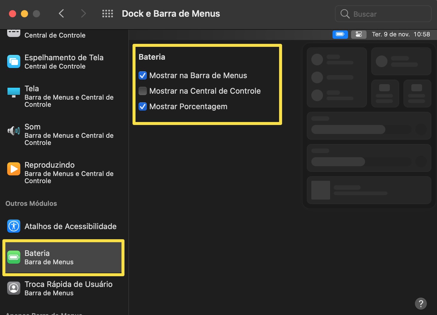 Após a atualização para o macOS Big Sur ou posterior, por padrão a porcentagem da bateria não aparecerá mais na barra de menus. Presumimos que a Apple fez isso para liberar espaço para na Central de Controle e outros itens da barra de menus.