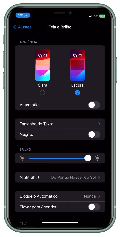O brilho da tela é um dos maiores consumidores de bateria. Reduzir o brilho ou ativar o brilho automático pode fazer uma grande diferença. Vá para Ajustes > Tela e Brilho e deslize o nível de brilho para baixo ou ative a opção de brilho automático.