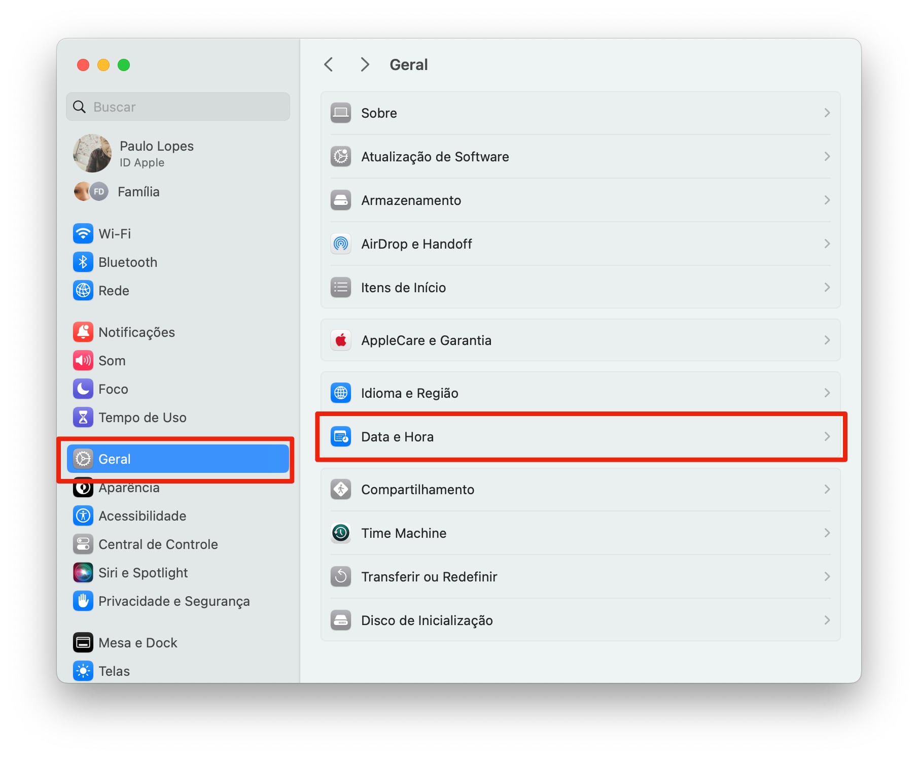 Primeiramente é preciso acessar os Ajustes do Sistema no seu Mac. Isso pode ser feito através do ícone no Dock ou clicando no menu Apple na barra de menus e selecionando “Ajustes do Sistema“. Dentro dos Ajustes, clique em “Geral” e, em seguida, em “Data e Hora”.