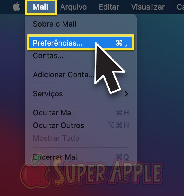 2. Certifique-se de que App Mail está com a janela ativa, em seguida clique em “Mail > Preferências” na barra de menu. Isso abrirá um menu suspenso com mais opções.