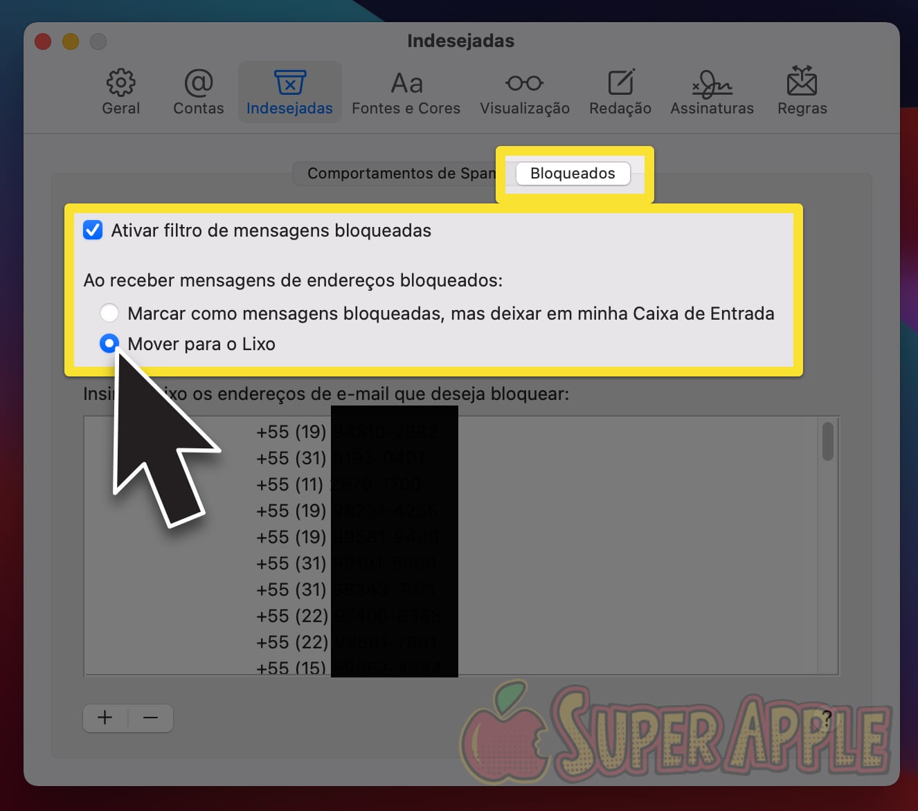 4. Na aba “Bloqueados” marque a primeira opção “Ativar filtro de mensagens bloqueadas”. Isso lhe dará mais controle sobre todos os seus e-mails bloqueados. Selecione a opção “Mover para o Lixo” e pronto.
