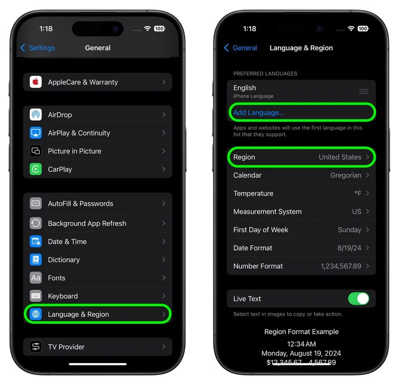 • Abra Ajustes, vá para GeralIdioma e Região.