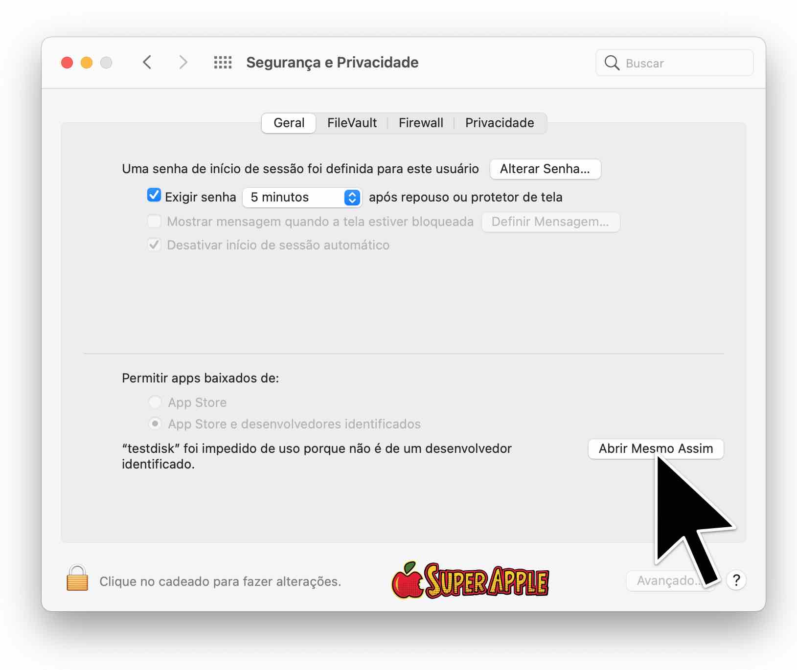 3. Clique no ícone de cadeado no canto e autentique com um login e senha de conta de administrador no Mac
