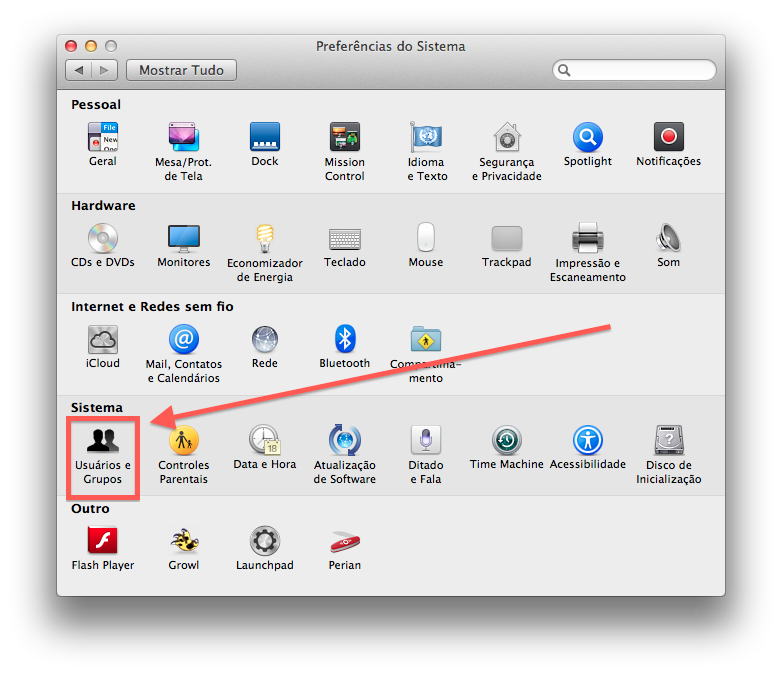 Esse controle deve ser aplicado a uma conta com controles parentais. Se você ainda não tem uma conta dessas criada, isso pode ser feito ser feito acessando Usuários e Grupos no painel Preferências do Sistema. Se preferir veja aqui