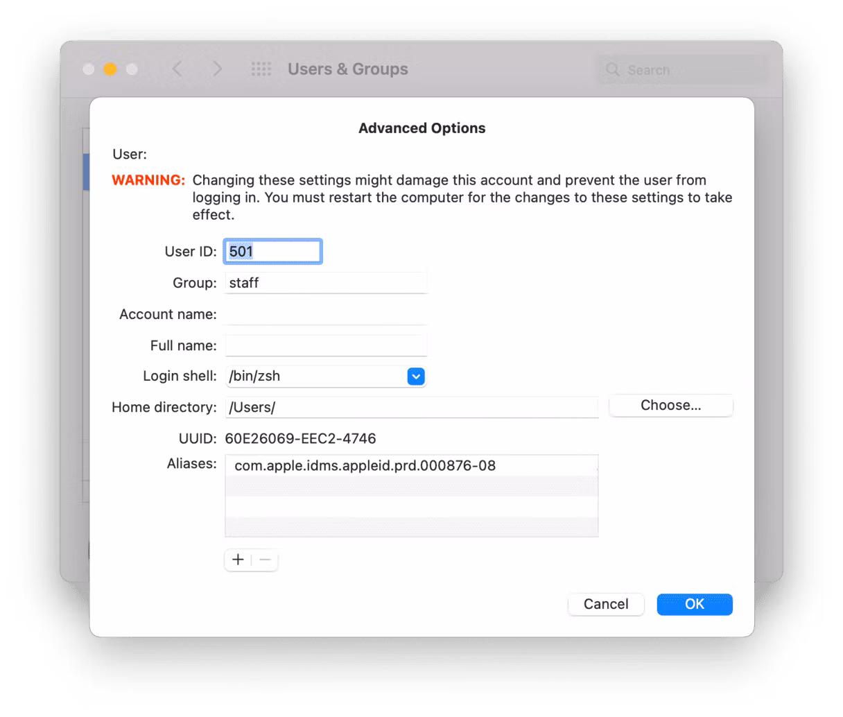 - Clique com a tecla Control pressionada ou clique com o botão direito do mouse no nome de usuário que deseja alterar.