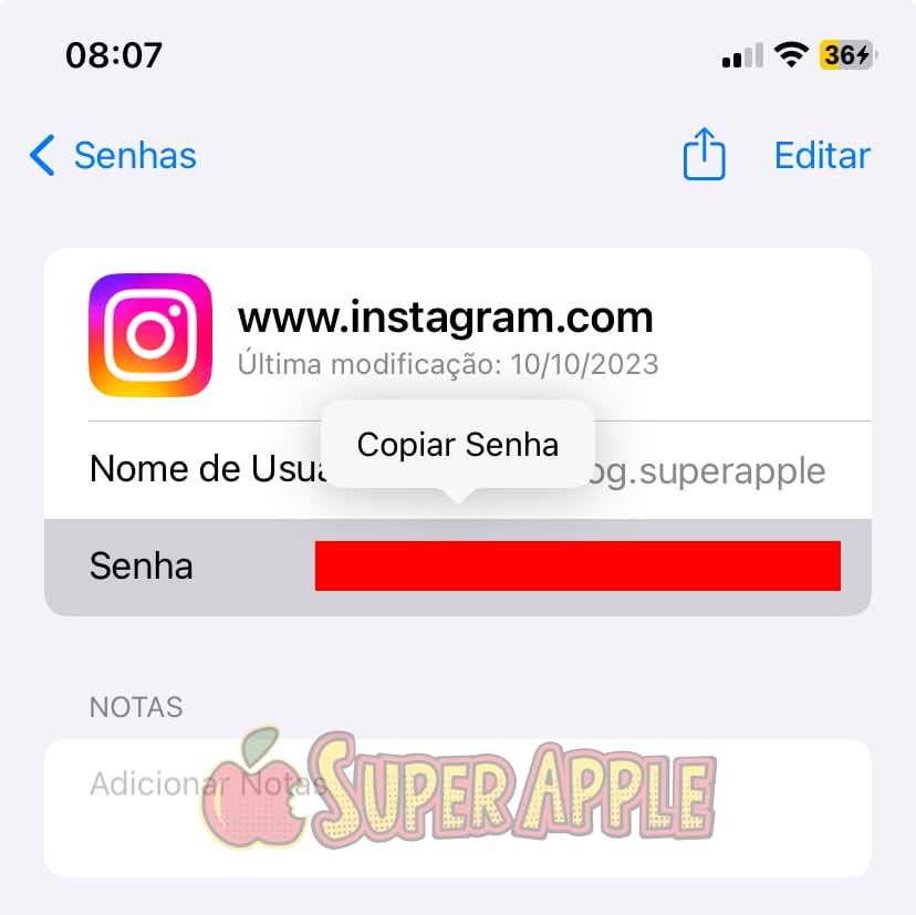 Para verificar, acesse Configurações do iPhone > Senhas > autentique-se > procure por “Instagram” e toque na senha ofuscada para visualizar a senha atualmente salva.