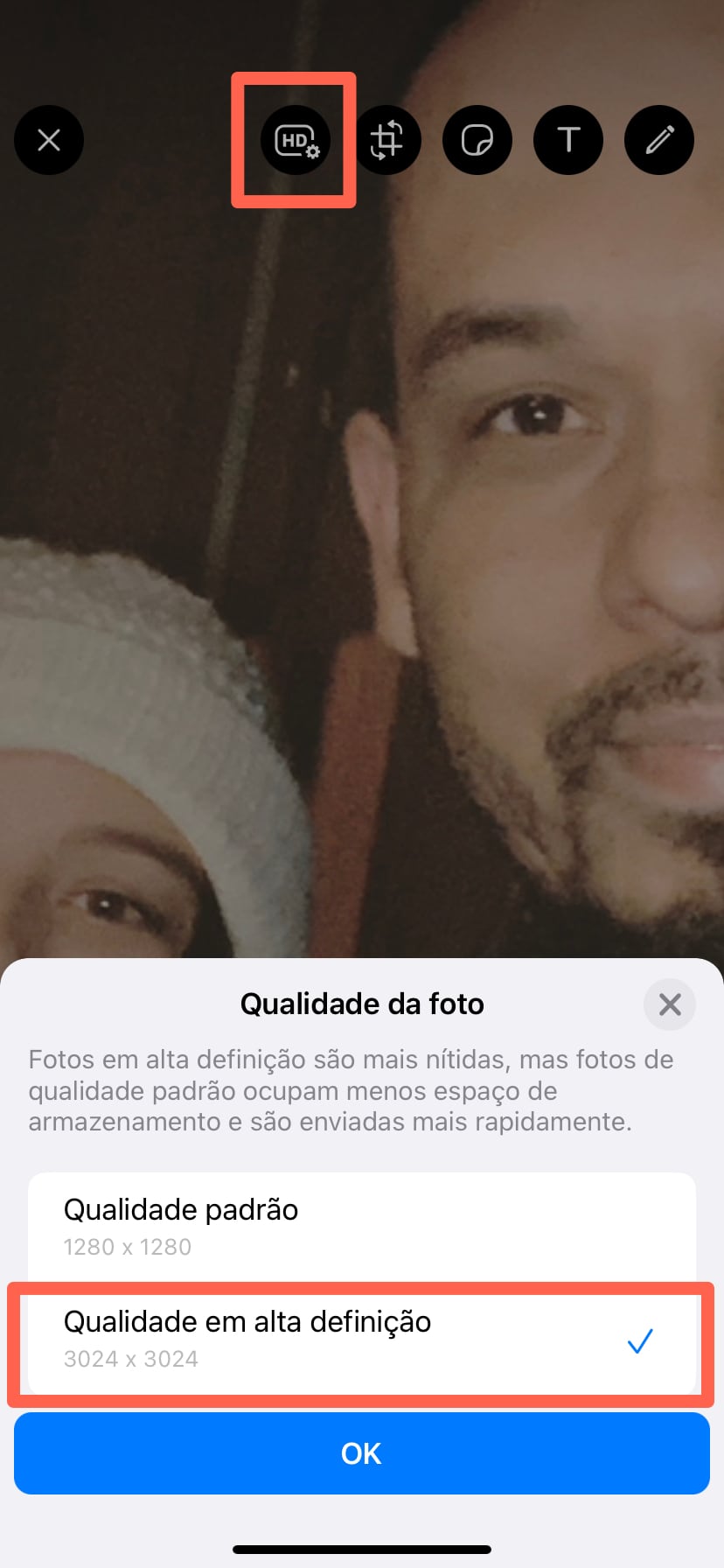 Você também pode continuar selecionando a imagem de resolução padrão se preferir manter os tamanhos de arquivo pequenos ou se não se importar em enviar fotos de melhor qualidade para frente e para trás.