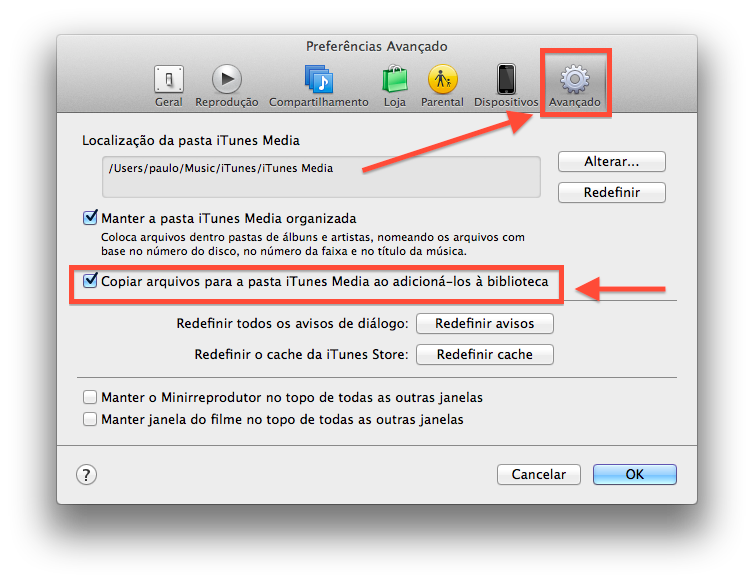 • Agora clique em Avançado e verifique se a caixa “Copiar Arquivos para a pasta iTunes Media do adicioná-los à biblioteca” está ativada, caso não, ative-a. Feito isso clique em OK.