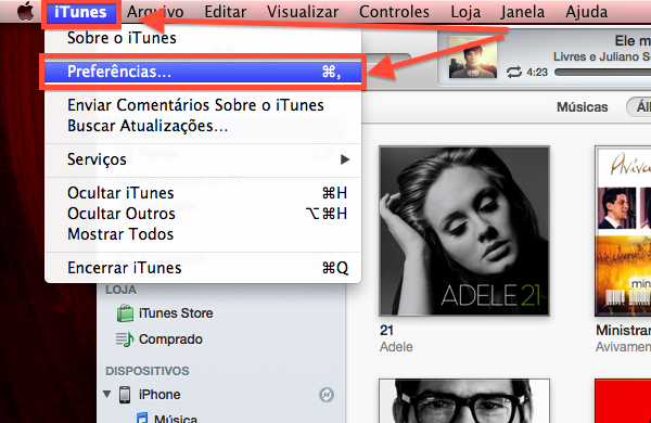 • Com o iTunes aberto clique no menu iTunes > Preferências, conforme a imagem abaixo: