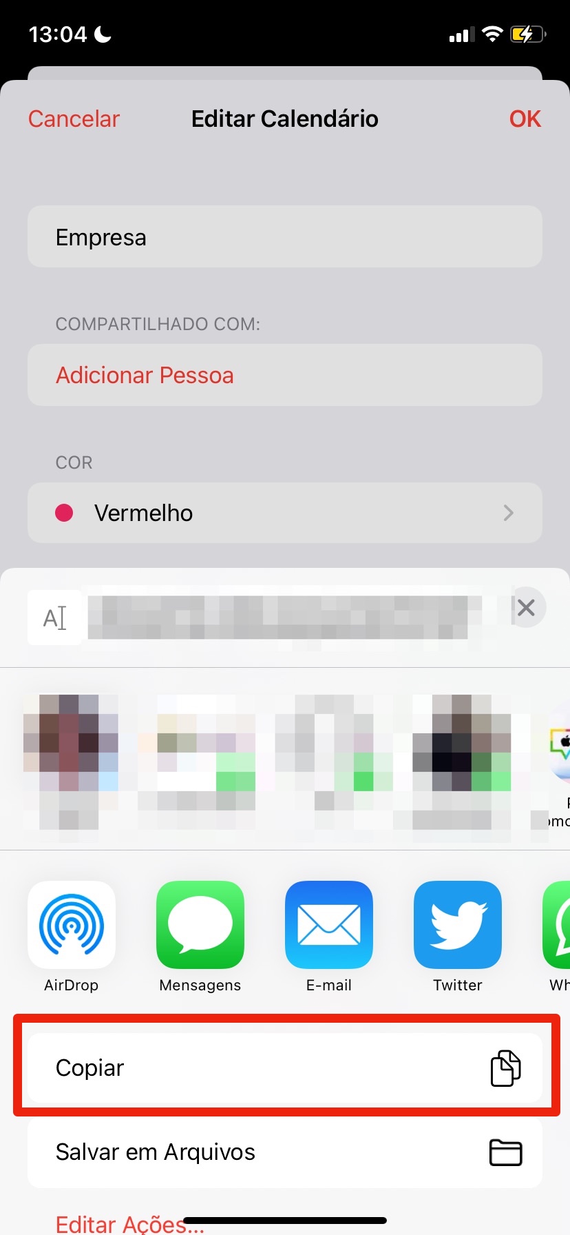 5. Uma vez ativado, você terá a opção de compartilhar o link para o seu novo calendário público. Toque em “Compartilhar Link” para abrir a planilha de compartilhamento do iOS.