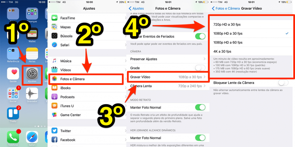 Por padrão o iPhone não vem com a função gravar em 4K ativada. Então você precisará configurar manualmente.