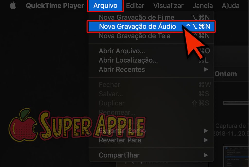 1. Abra o QuickTime Player, aplicativo que se encontra na pasta Aplicativos/utilitários. Na barra superior, clique em “Arquivo”. Note que um menu será aberto, nele clique em “Nova Gravação de Áudio”.