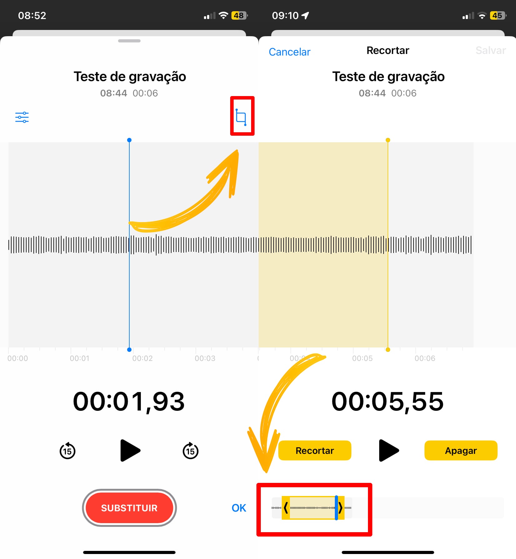 Mesmo que você saia do aplicativo Gravador sem tocar em Concluído, o novo áudio já será salvo no arquivo. Portanto, tenha certeza absoluta do que deseja substituir antes de prosseguir com tais alterações.