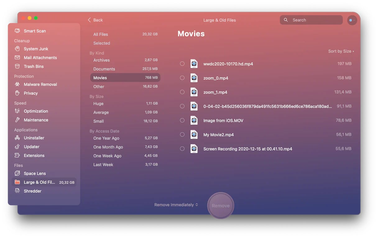 Se você fizer muitas gravações de tela no seu Mac, elas rapidamente ocuparão muito espaço. E a menos que você seja diligente em nomeá-los e armazená-los, encontrar os vídeos para excluir os que você não precisa pode ser complicado. O CleanMyMac X pode ajudar com isso. Seu módulo Arquivos Grandes e Antigos rastreia os arquivos maiores e mais antigos do seu Mac e permite que você os filtre por tipo — por exemplo, Filmes — e depois os ordene por tamanho.