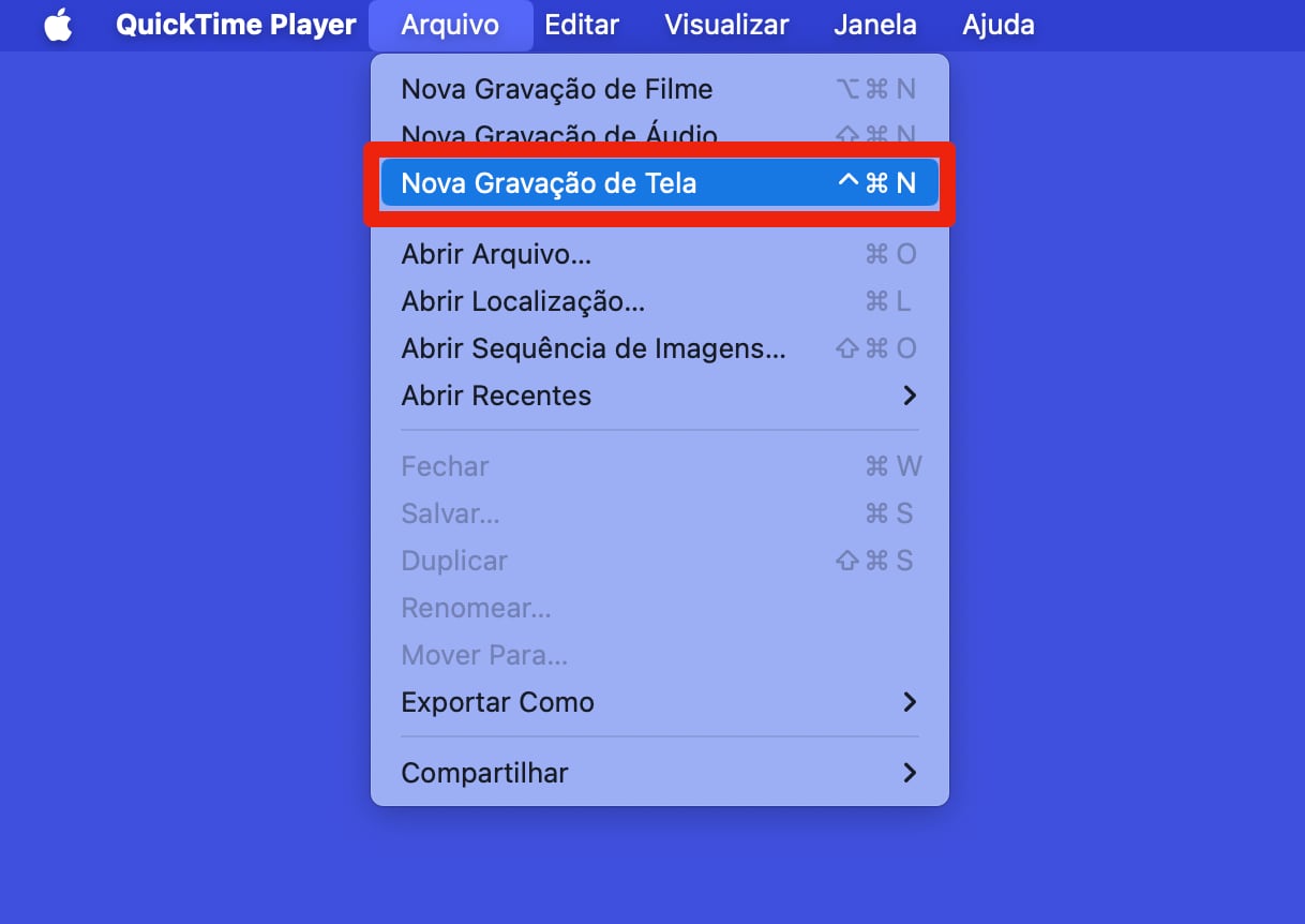 4. No QuickTime Player, escolha Arquivo > Nova Gravação de Tela ou Control-Command-N.
