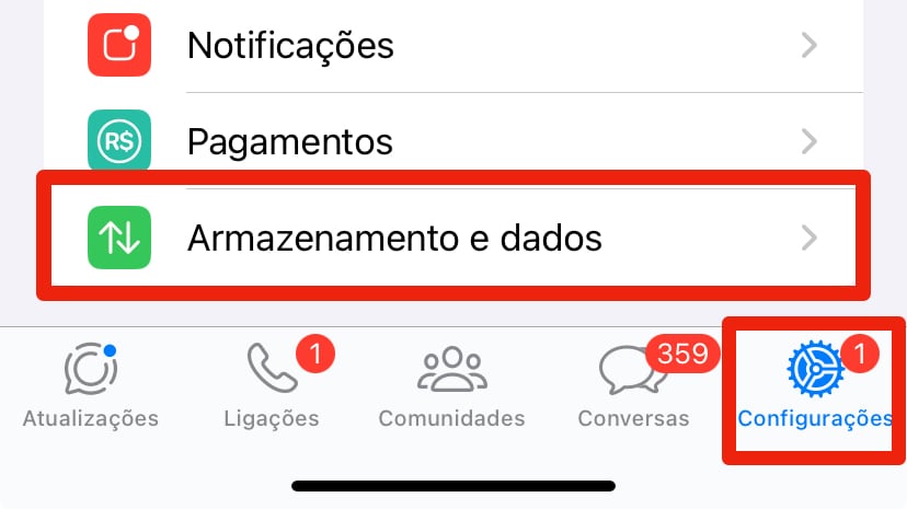 1. Inicie o WhatsApp e, na tela de conversas, selecione a opção ‘Configurações’ localizada na barra inferior. Em seguida toque em Armazenamento e Dados