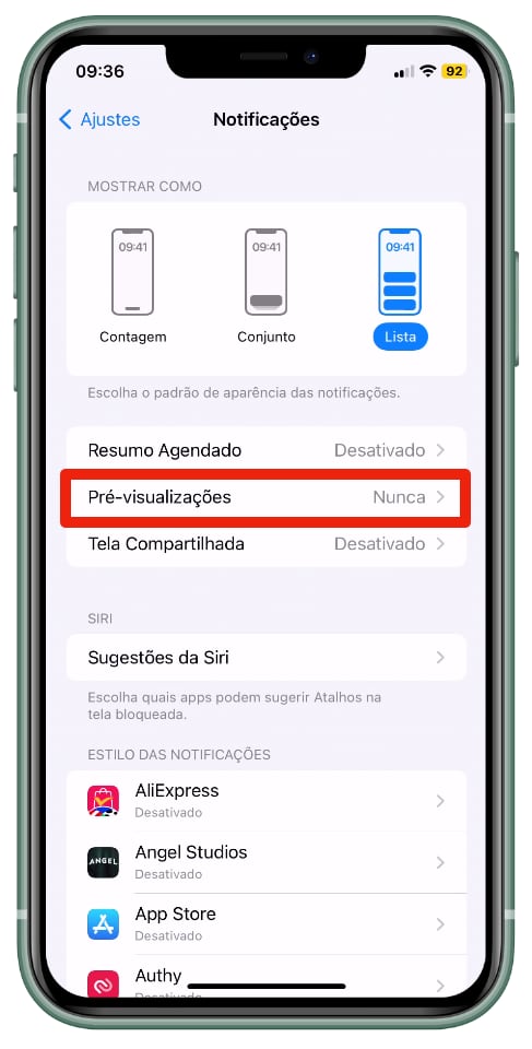 - Abra Notificações e toque em Mostrar Pré-visualizações.