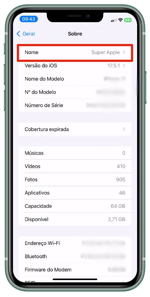 1. Vá em Ajustes > Geral > Sobre > Nome.