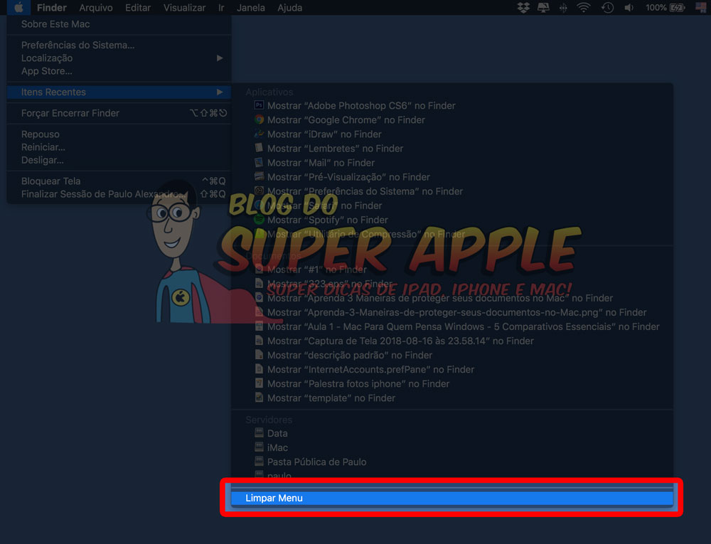 A segunda opção (e minha preferida) é que sempre que você sair, clique em Limpar Menu, no final da lista antes de deixar o Mac sozinho. Este recurso é chamado de “Armadilha”, e é um velho conhecido dos usuários de Mac. Ele é muito utilizado por aqueles que sempre “tem um pé atrás”. Quando voltar ao Mac não faça nada antes de olhar o Menu “Itens Recentes”.