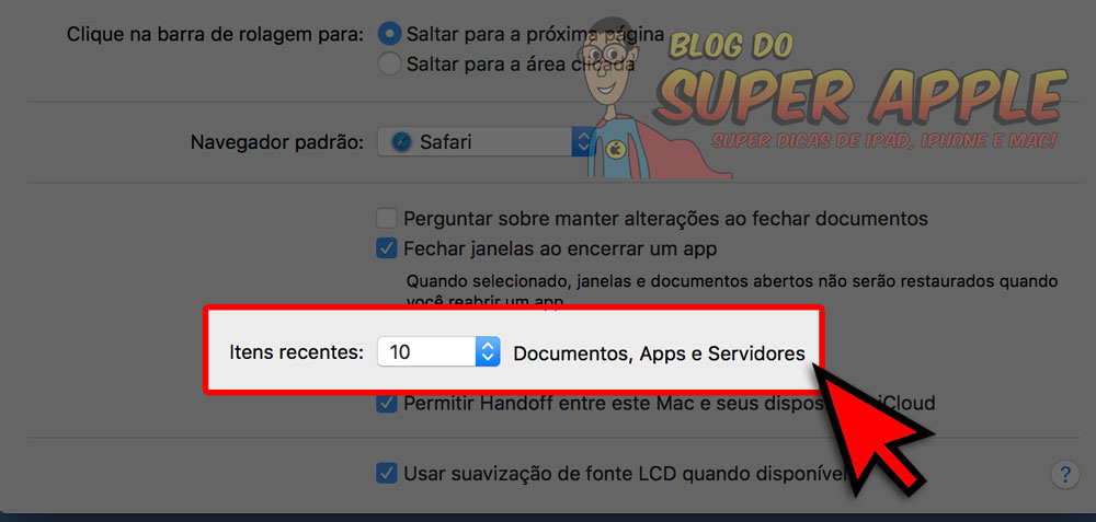 Clique em Preferências do Sistema > Geral onde é possível configurar a quantidade de “Itens Recentes” que aparecerá no menu.