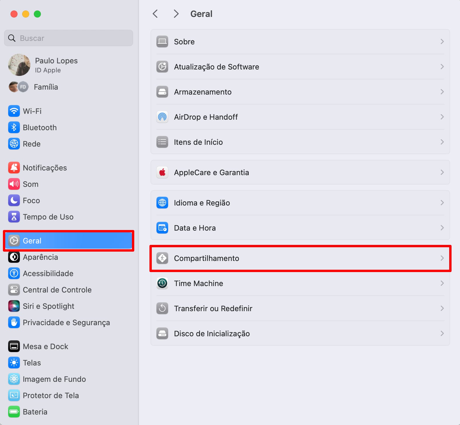Dentro dos Ajustes do Sistema, clique em “Compartilhamento”.