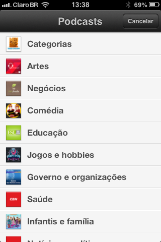 Se você tocar em melhores emissoras, poderá navegar entre os Podcasts mais famosos do iTunes a partir de gêneros específicos como Design ou negócios. Na parte superior do aplicativo você pode optar por podcasts em áudio ou vídeo, além de acessar o catálogo do iTunes.