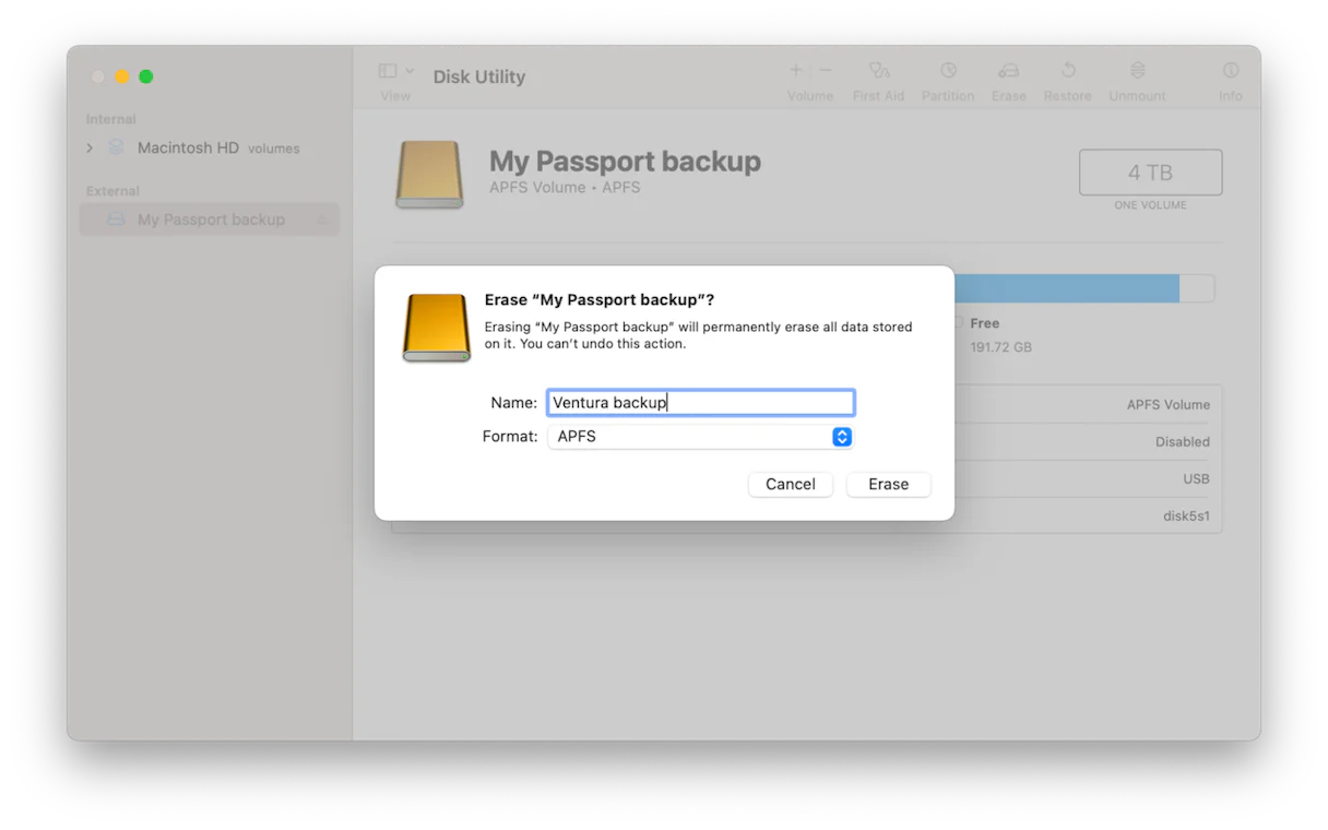 - Clique em Apagar Com o disco externo selecionado, clique no botão Apagar na barra de ferramentas superior.