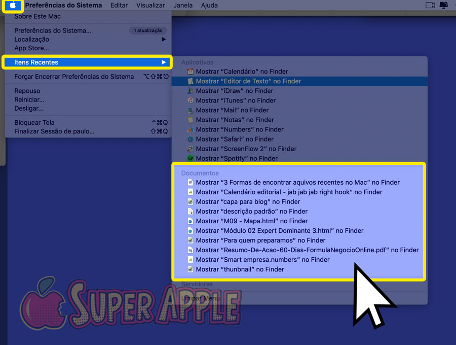Sim, começaremos pelo menu principal do MacOS, sistema do Mac, o Menu Apple, representado pela pequena maçã localizada no canto superior esquerdo da tela. Para utilizar-lo, primeiro clique em “Menu Apple ()” em seguida “Itens Recentes”.