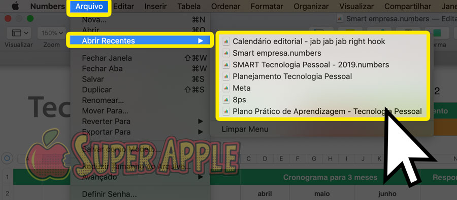 Se você sabe que está procurando um arquivo de texto feito no Pages, mas não sabe qual é o nome dele, já tem metade do caminho realizado. Você também pode encontrar arquivos recentes no Mac através do menu do próprio aplicativo. O atalho para acessar seus arquivos abertos dentro do programa é “Arquivo” em seguida “Abrir Recentes”