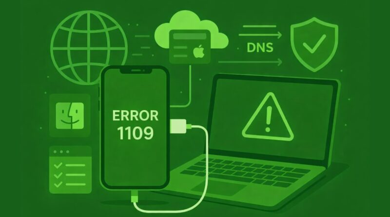 O erro 1109 geralmente aparece por problemas de conexão com os servidores da Apple. As causas mais comuns são DNS mal configurado, VPN ativa, firewall bloqueando a rede ou cabo USB defeituoso.