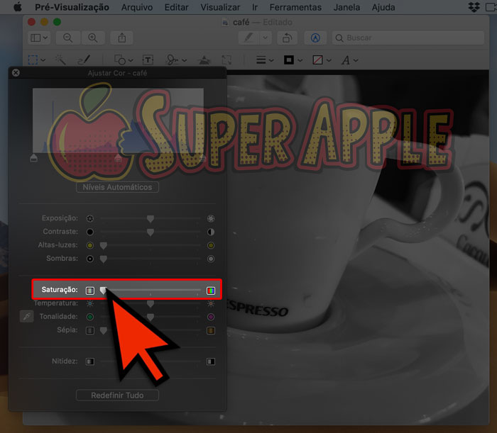 3. Note que uma pequena janela se abrirá, nela você terá várias opções, incluindo “Saturação” que é onde configuraremos a foto em preto e branco.