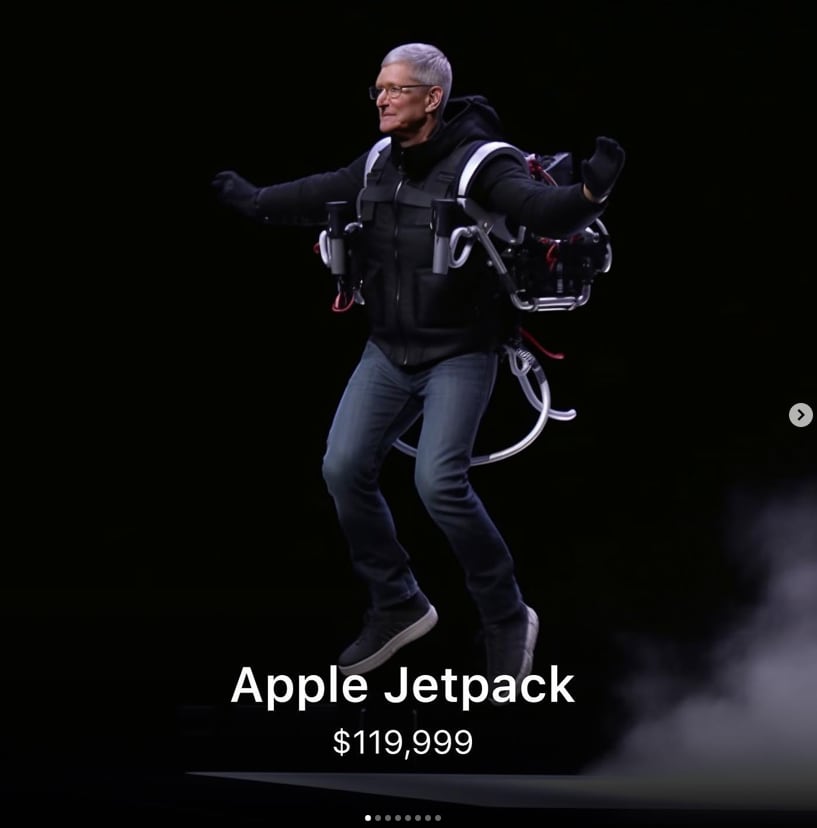 O perfil do Instagram imagesby.ai carrega um monte de invenções impossíveis ou verdadeiramente realistas feitas pela Apple. Quem sabe, talvez os anos acabem dando razão a uma dessas invenções. Nele, também podemos encontrar uma moto elétrica que custa mais do que um jetpack. Além dos produtos tecnológicos, chama a atenção o valor que a IA sugere para uma simples cadeira – quase R$ 5 milhões.