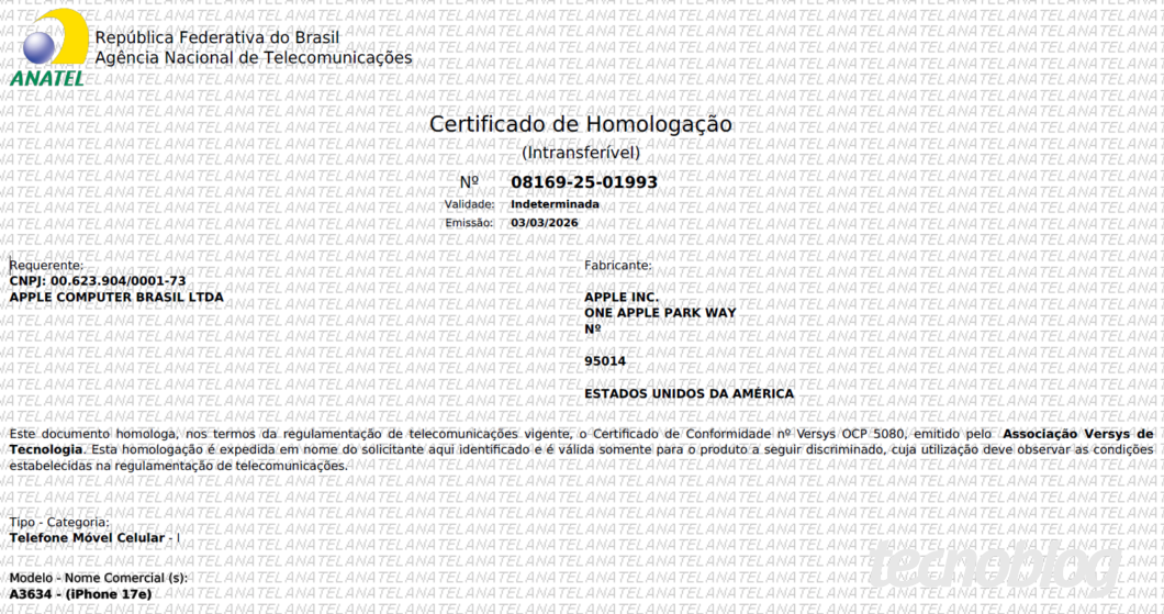 A aprovação foi publicada pela Agência Nacional de Telecomunicações, responsável por certificar smartphones e outros dispositivos que operam nas redes brasileiras.