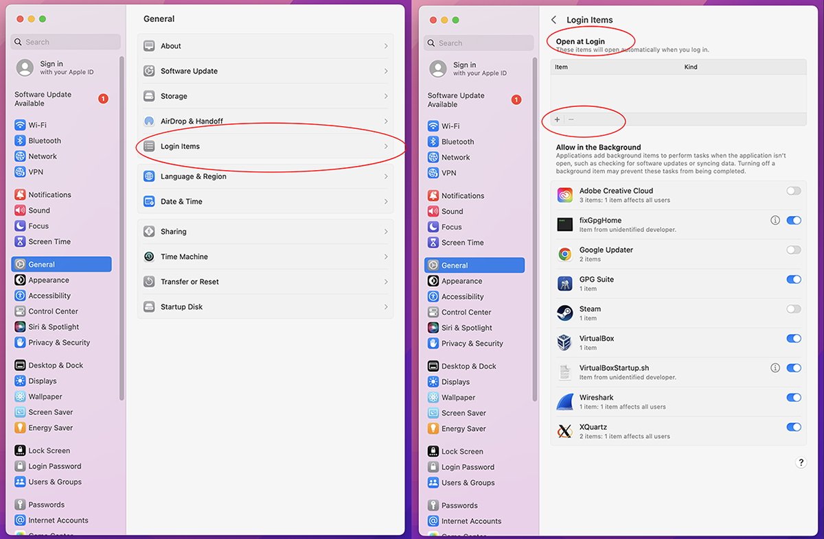 A Apple sempre permitiu que os apps iniciem junto com o sistema. Em 2022, a Apple mudou a lista de itens de login do Painel de Preferências para o menu de preferências Gerais, que podem ser acessados no painel Preferências do Sistema.