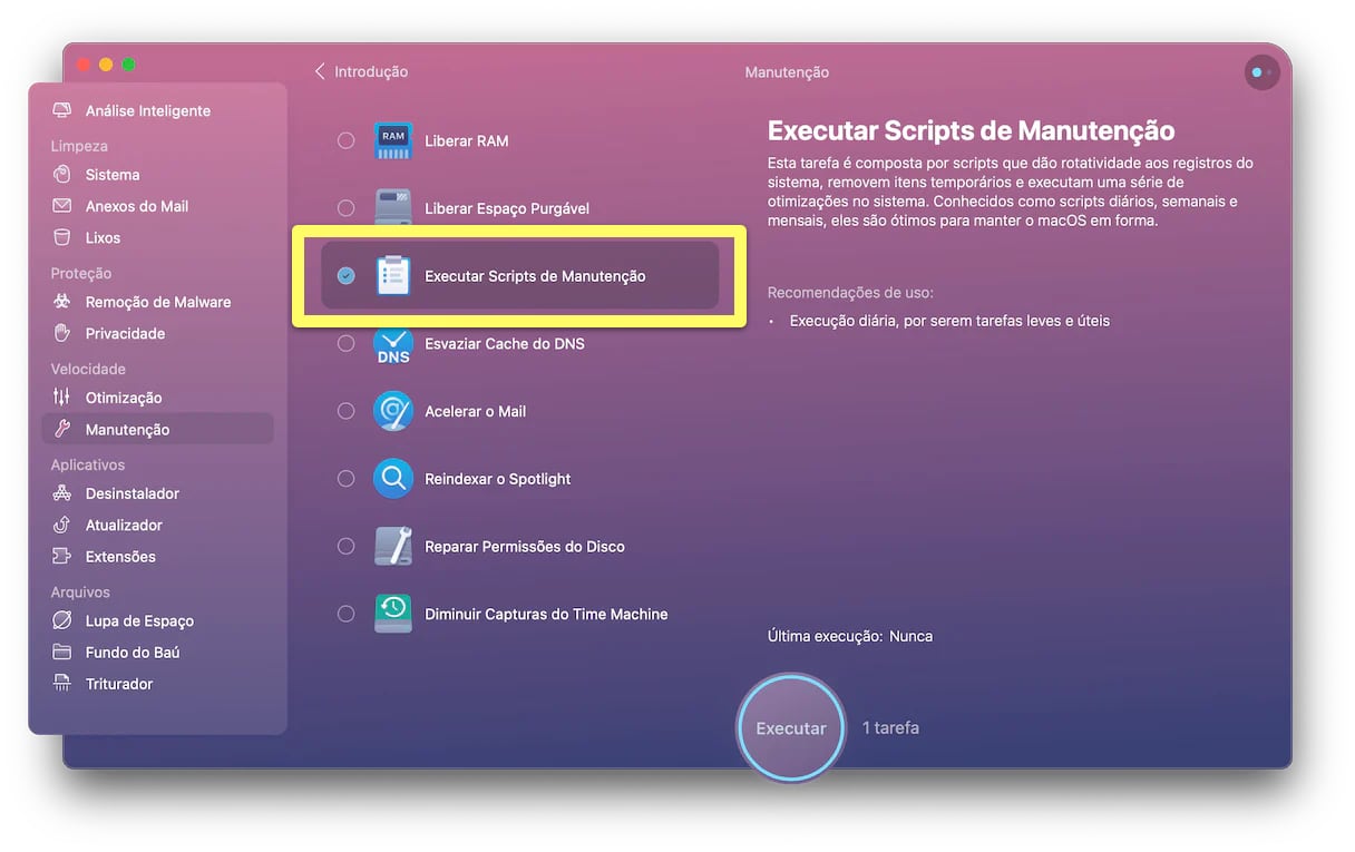 A maneira mais simples de realizar os scripts de manutenção é delegar essa tarefa a um aplicativo dedicado, como o CleanMyMac X. Este aplicativo possui diversos módulos para manter o Mac livre de arquivos desnecessários, incluindo um módulo específico para manutenção. Neste módulo, é possível executar os scripts de manutenção com apenas um clique. Faça o download gratuito do CleanMyMac X aqui.