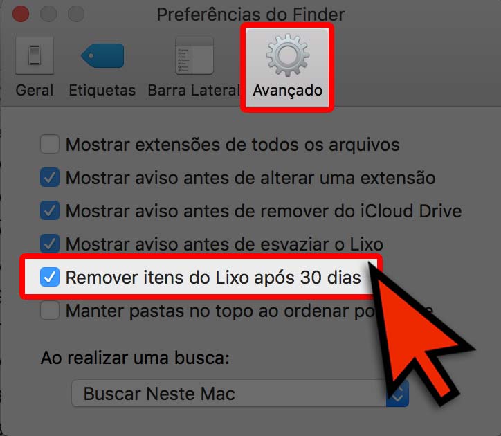 - Para ativa-lo, clique no Menu Finder > Preferências. Em seguida clique em Avançado > Remover itens do Lixo após 30 dias.