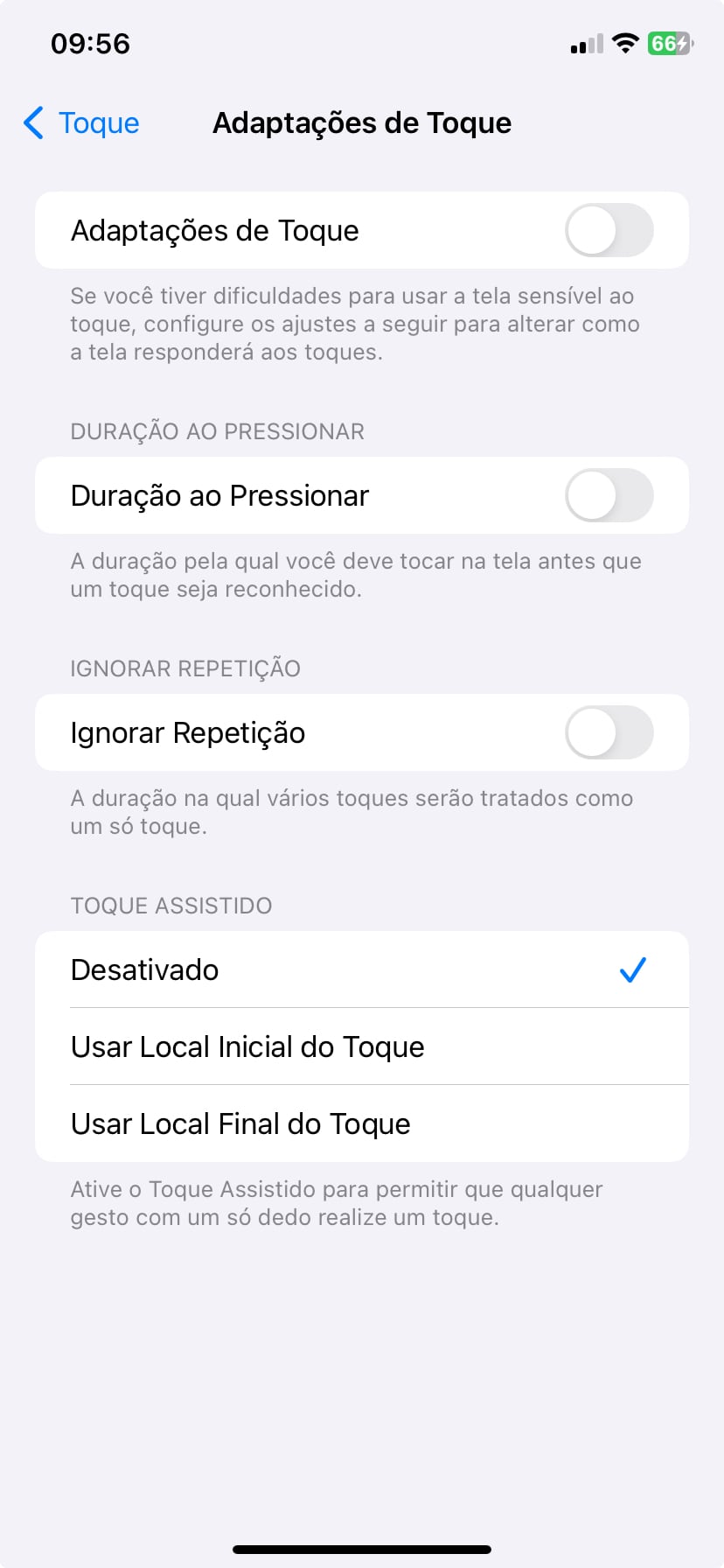 Para remover isso, toque em Ajustes > Acessibilidade > Toque > Adaptações de Toque. Desative a Duração ao Pressionar, Ignorar a Repetição, escolha Desativado para Adaptações de Toque e Acomodações de Toque.