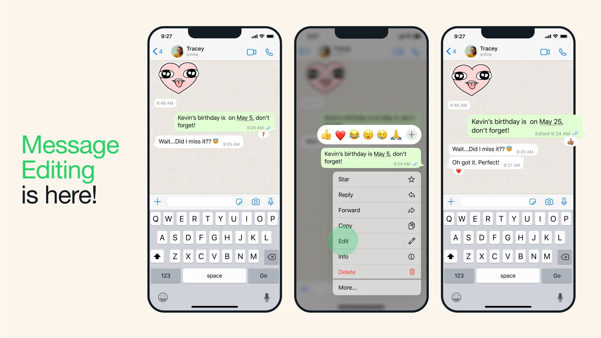 Desde corrigir um simples erro de ortografia até adicionar contexto extra a uma mensagem, estamos empolgados em lhe trazer mais controle sobre seus bate-papos. Tudo o que você precisa fazer é pressionar longmente uma mensagem enviada e escolher ‘Editar’ no menu por até quinze minutos depois.