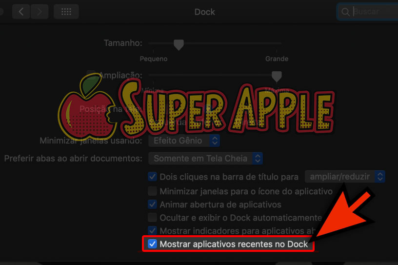 2. Na nova janela, deve estar marcada a opção “Mostrar aplicativos recentes no Dock”. Desmarque-a.