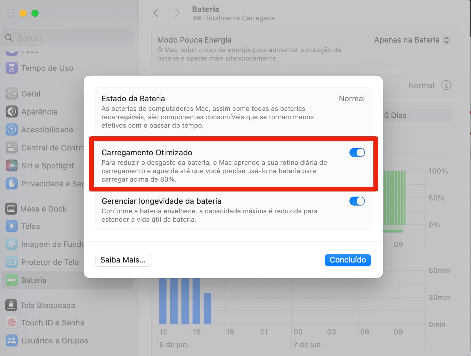 As versões modernas do macOS possuem recursos integrados de otimização da bateria que ajudam a prolongar sua vida útil. Esses recursos aprendem os hábitos de uso e carregamento do seu laptop, evitando que ele permaneça completamente carregado por longos períodos. Por exemplo, se você conecta seu MacBook todos os dias às 8h e o desconecta às 16h, o sistema manterá a carga em 80% até perto do final do dia, quando então completará a carga para 100%.