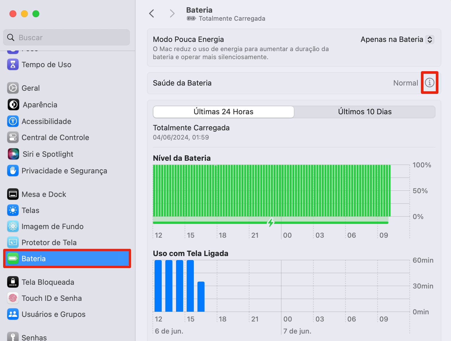 • Primeiramente acesse o menu Apple () > Ajustes do Sistema > Bateria > Saúde da Bateria. Aqui pressione o pequeno “i”, conforme indicado na imagem abaixo.