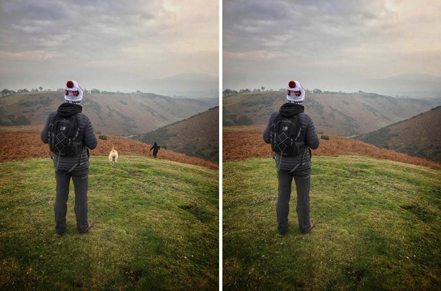 Abaixo você pode ver as versões anterior e posterior da imagem. Demorou menos de um minuto para apagar o cão e a pessoa desta foto: