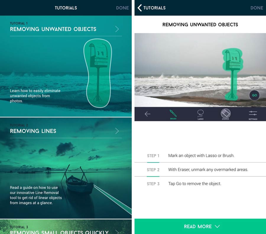 O aplicativo TouchRetouch também possui alguns tutoriais úteis mostrando como usar cada uma dessas ferramentas. Para acessar esses tutoriais, volte para a tela inicial do aplicativo, tocando no ícone Início, na parte superior esquerda da tela, e selecione Tutoriais.